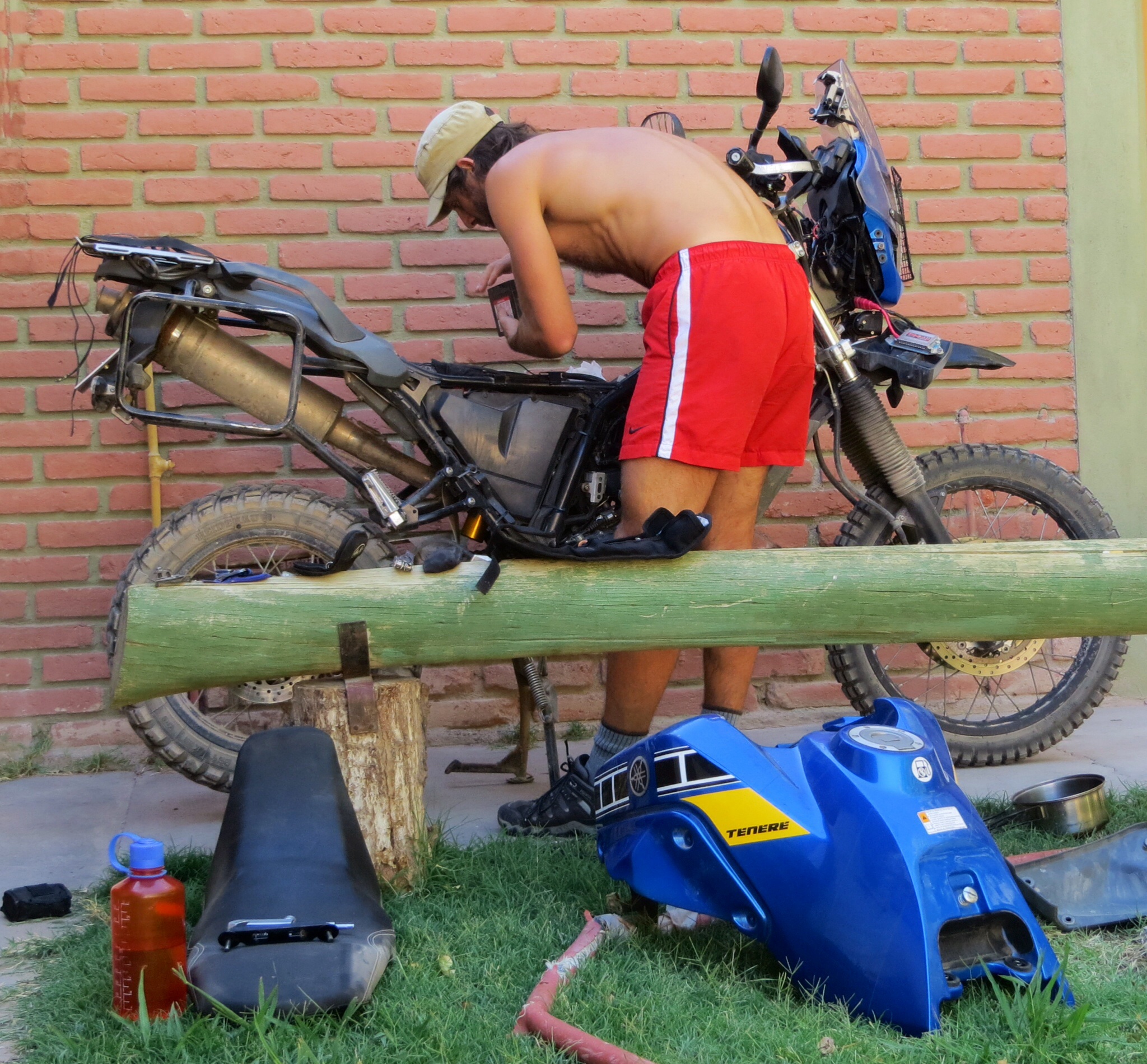 CallingastaI was feeling optimistic and decided to push on a little further before stopping for the evening. The bike had started immediately and was running without missing a beat. Then, after 20km, the engine cut out again. And again 15km later. I should have been savouring the stunning and dramatic landscape which by now was bathed in a soft evening light, with long shadows accentuating every fold in every hillside. Instead, I was getting a bit hot under the collar, shall we say. I made it to within 2km of the centre of the next village, Callingasta, when the moto finally dug her heals in. I waited for her to cool down, I free-wheeled the downhill bit, I tried to cox her home in first gear, I changed the spark plug. In the end I had to ignominiously push her across the long bridge and into the village. It was 10pm and I was in no mood to camp. So I booked into the local ‘hotel’ at about £12 a night – aircon, a shower and a double bed…..