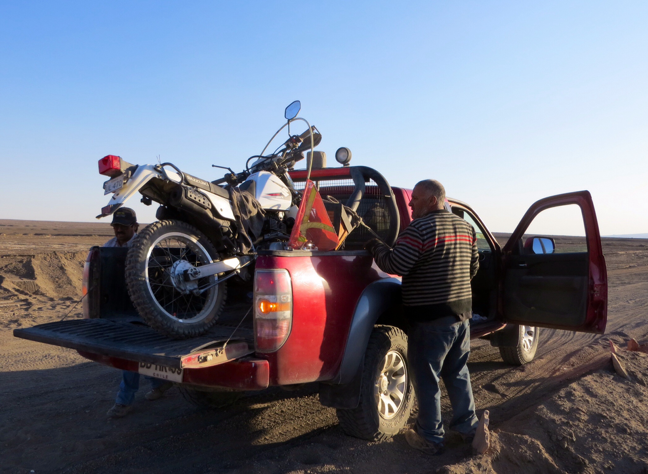Pau was fine. The Suzuki wasn’t. Wing mirrors and lights were broken, and when I picked it up and checked the front end it was clear the bike had hit something hard and at speed. The front wheel and the handlebars were misaligned by about 20 degrees and one spoke had been snapped. I loosened the bolts of the triple clamp (the piece that hold the front forks to the frame) and attempted to realign the wheel, but it wasn’t happening. It quickly became apparent that we had only one option – to return to Calama. Within an hour we had flagged down a pair of miners in a 4×4 and were heading south. On Monday morning the moto was back in the hands of Edwin and his sidekick, Jose.