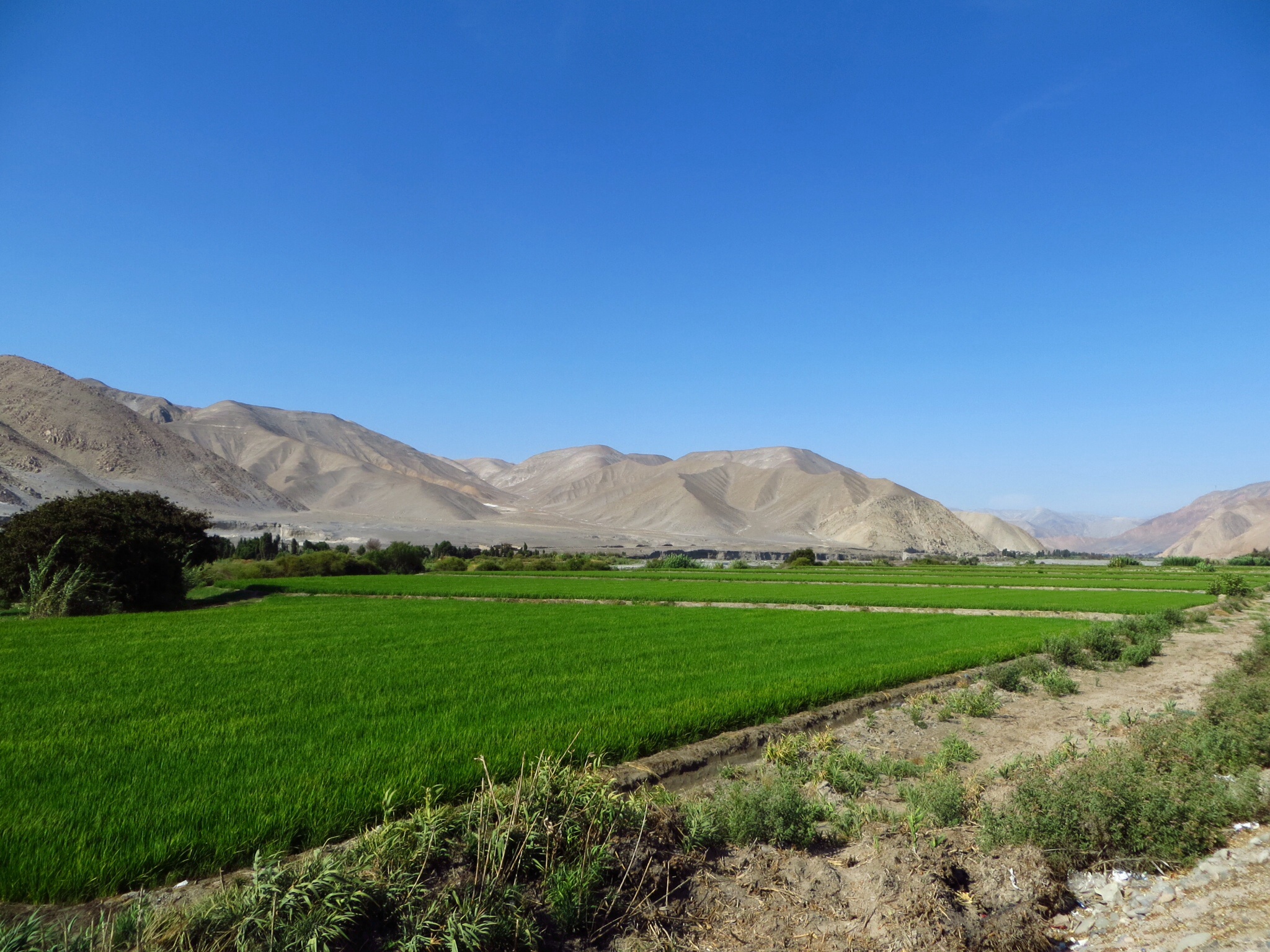 Desert VallesyWith my Heath Robinson switch attached to the handlebars, we struck out for Arequipa in Peru. Once across the border and north of the town of Tacna, the ride through the Peruvian desert was beautiful. I had expected more of the same after the Chilean Atacama, but instead we were treated to rolling dunes of beautiful oranges and soft browns, rugged cordilleras and the occasional valley of almost luminous green, where mountain rivers dissected the desert and irrigated lush fields of young wheat, vines and other crops. And it also ‘felt’ different. Peru has a very different energy to Chile. I couldn’t put my finger on it, but it was very tangible – softer, lighter, altogether more relaxing.