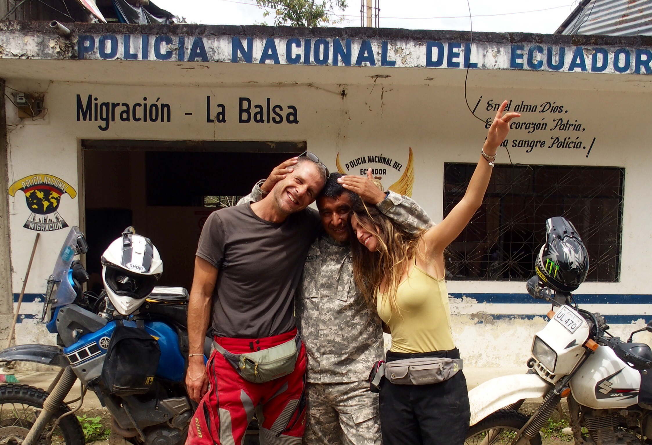 imageAs soon as we arrived, he greeted us warmly, welcoming us to Ecuador in very broken English. When we were done with the immigration officer, Edwin then set about rolling out the red carpet. Before any business commenced, he offered me a cold beer and joined me in drinking it. Then came popcorn. As he waited for his colleagues to phone him back with the required authorisation code, he insisted that I removed the Ecuadorian flag sown to his uniform with my knife, to take as a souvenir. War stories were exchanged – he had fought during Ecuador’s brief skirmish with Peru back in Eighties in the nearby jungle. Then the conversation switched to bands from the UK, of which he was a fan – Pink Floyd, ACDC, and of course the Beatles. Even when the paperwork was done, we couldn’t escape. He presented me with a t-shirt, and insisted Pau removed and took the badge from the other sleeve of his uniform. We finally left armed with numerous photos, his address in the north of the country and an invitation to stay, and a slightly dizzy head. Welcome to Ecuador, indeed.
