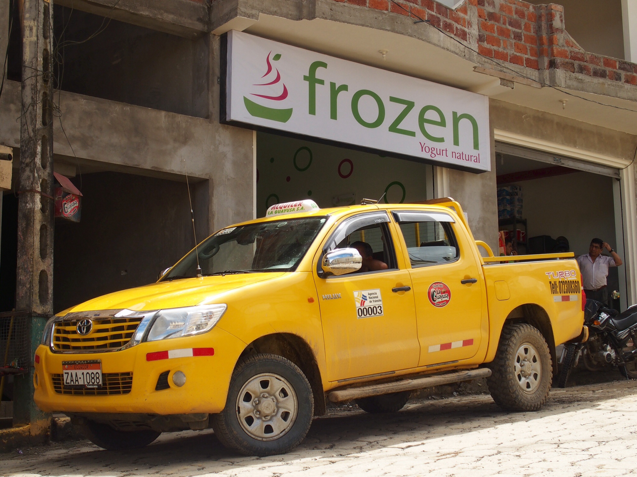 imageZumba is the first settlement you reach. Straddling large village / small town status and surrounded on all sides by jungle-covered hills, it is an unremarkable place, but for two things that caught my eye. The taxis, painted New York cab yellow, are all 4×4 pickups – eminently sensible given the rugged surroundings, but something I have not come across anywhere else. And nestled amongst the usual fare of hardware stores, pharmacies, internet cafes and restaurants on the Main Street is a frozen natural yogurt parlour. It would have looked perfectly at home in one of the modern shopping malls that we encountered in the major cities of Peru and Chile, but looked comically incongruous here. Needless to say, it received plenty of our custom during our short stay.