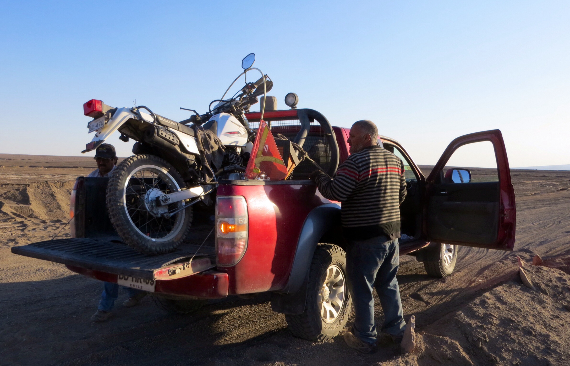 When my progress up Ruta 40 was blocked by fifty kilometres of thick mud, it took four of us, assisted by a earth ramp, to get my Tenere in the back of a pick-up. When Pau crashed her DR200 in the Atacama Desert after hitting sand (on an otherwise pretty good road), two of us simply lifted it into a similar pickup. Had it been the Tenere needing a piggyback on that occasion, we would have been looking at a long night in the desert awaiting help.