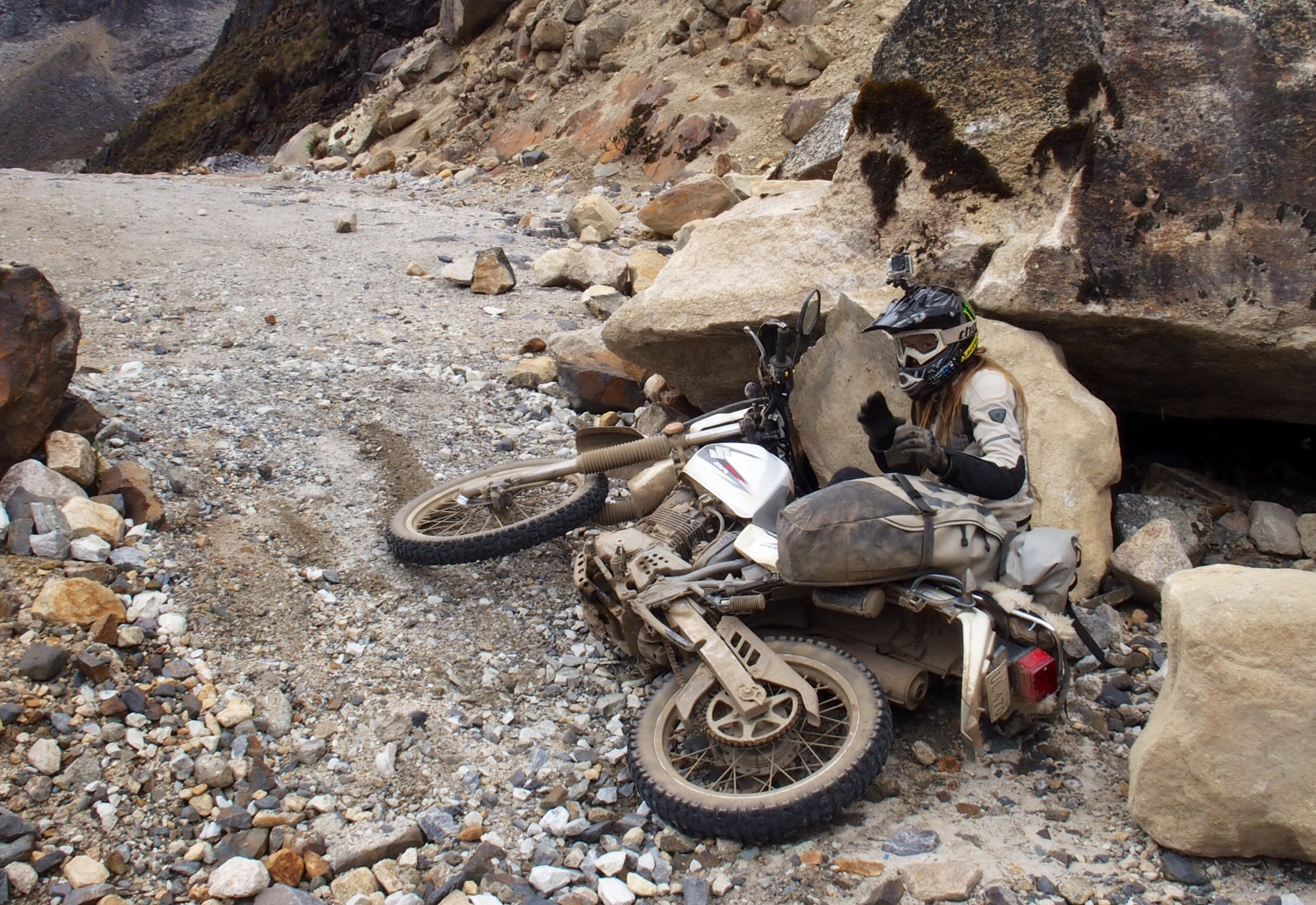 Then onwards and upwards through the rocks and rubble. Now above 4800 metres, the Suzuki showed its lack of lungs for the first time on the whole trip. We came across a couple of short, steep sections on the hairpins where rockfalls had created little ‘ramps’; the little DR200 simply couldn’t make it. Opening the throttle to get more power, the engine died as it failed to draw in enough oxygen. Then, as if to heighten the tension as the snow began to fall with more determination, an intermittent electrical gremlin that had been with us all the trip decided to return – the bike wouldn’t start. As I removed the fairing to get to the wiring, I wondered what the recovery plan from this somewhat isolated spot would be.
