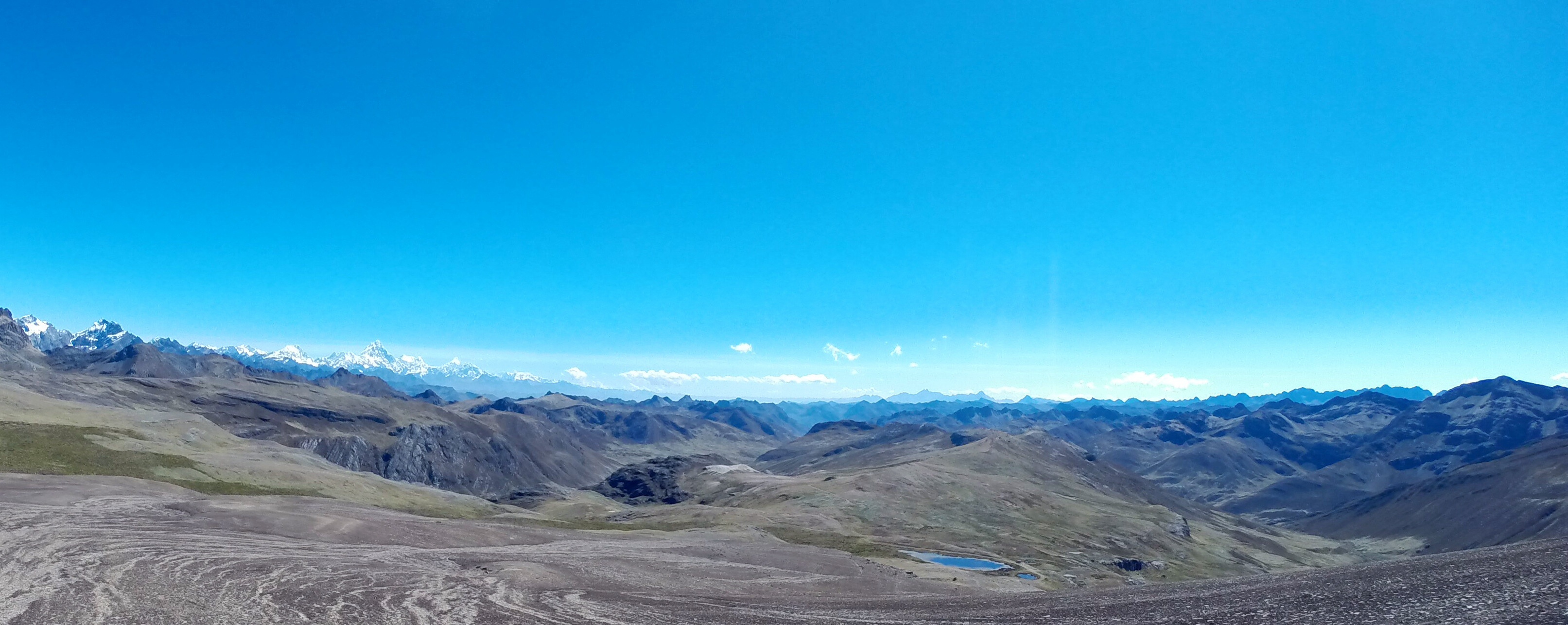 I came across a gentle, shale-covered hill beside the track and felt compelled to ride up it. As I crested the top, the dagger-like, ice-covered mountains of the Cordillera Huayhuash appeared in front of me. I turned around and saw the beautiful peaks of the Cordillera Blanca standing shoulder-to-shoulder to the north. Lesser mountain ranges and valleys stretched to the horizon in the east. I couldn’t even begin to estimate how far into the distance I could see, so vast was the scale of the landscape. All I could do was stand there, slowly pirouetting around and around as I tried to take it all in. On this occasion, superlatives were the only option.